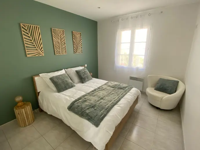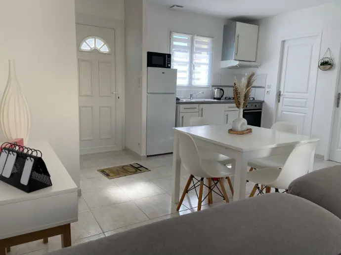 Elle dispose d’une chambre avec un lit double et d’un canapé convertible dans le salon, pouvant accueillir confortablement jusqu’à 4 personnes. La cuisine est fonctionnelle et bien équipée pour préparer vos repas sur place. À l’extérieur, profitez d’un jardin agréable équipé de transats pour vos moments de détente et d’un barbecue pour des repas conviviaux en plein air.